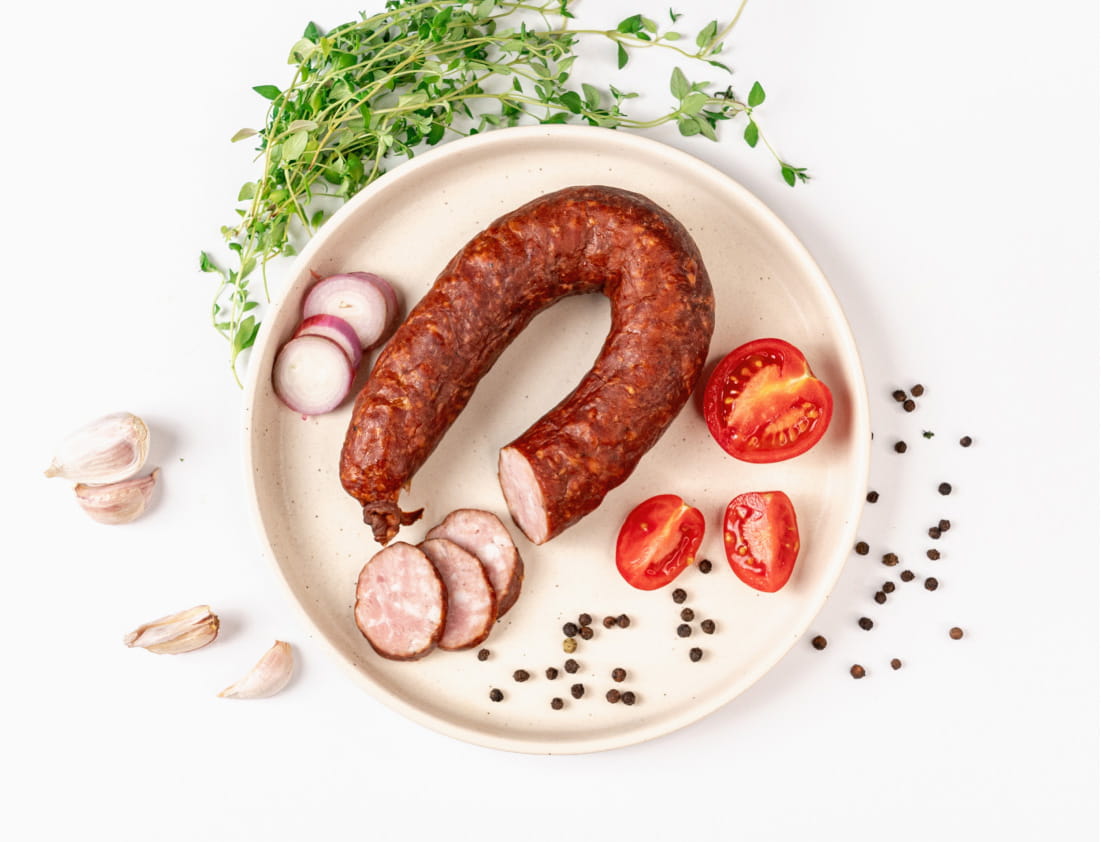 Kiełbasa średniorozdrobniona wieprzowa, wędzona, pieczona.