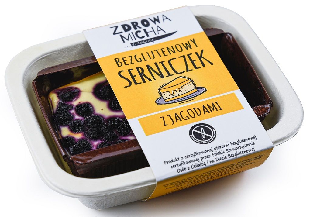Serniczek z jagodami Zdrowa Micha powstaje w 100 % z naturalnych składników. Jest smaczną propozycją dla wszystkich dbających o zdrowie oraz dla osób z celiakią i będących na diecie bezglutenowej. Stanowi urozmaicenie diety dzieci, młodzieży i dorosłych. Delikatny, kremowy i klasyczny sernik ze świeżymi jagodami, pieczony bez spodu.