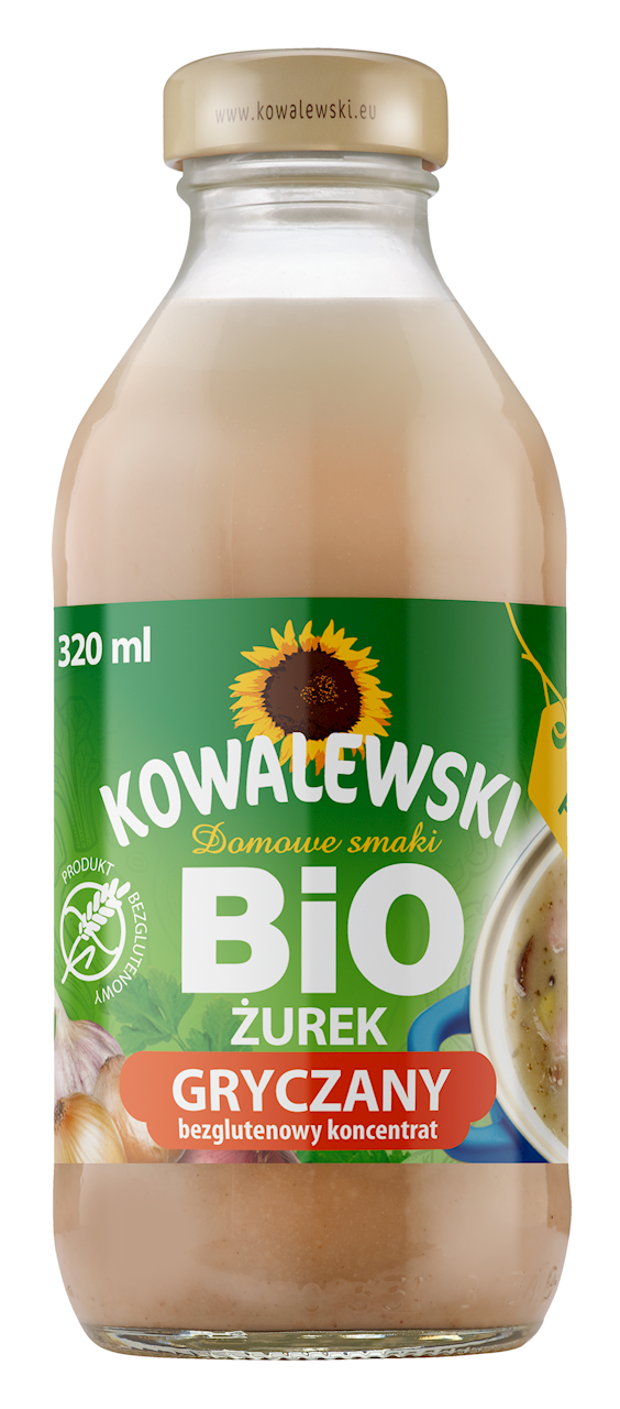 Ekologiczny koncentrat żurku gryczanego jest bezglutenowym produktem rolnictwa ekologicznego przeznaczonym dla konSUMentów chcących odżywiać się bezglutenowo. Koncentrat składa się wyłącznie z bezglutenowej mąki gryczanej, wody i soli - składniki te poddawane są naturalnemu kiszeniu. Produkt pasteryzowany. Przed użyciem mocno wstrząsnąć butelką. Ekologiczny koncentrat żurku dodać do 0,6 litra wrzącej wody lub bulionu i zagotować. Przyprawić do smaku.